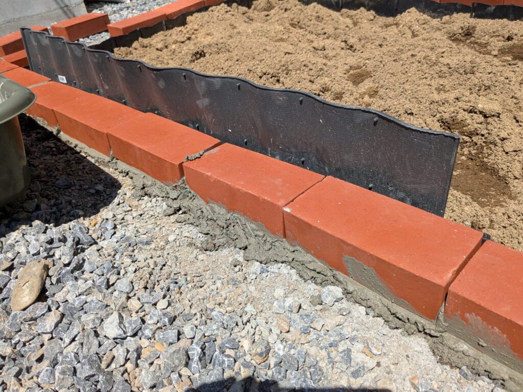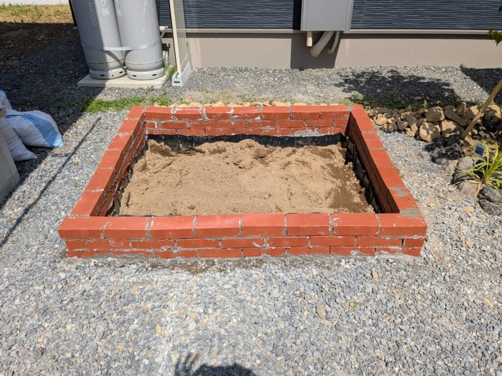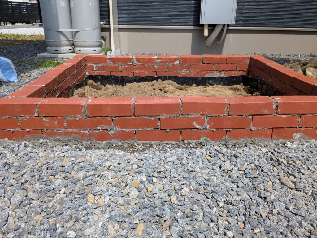 レンガひとつひとつを丁寧に積み重ねてようやくガーデニング風の囲いが完成です。